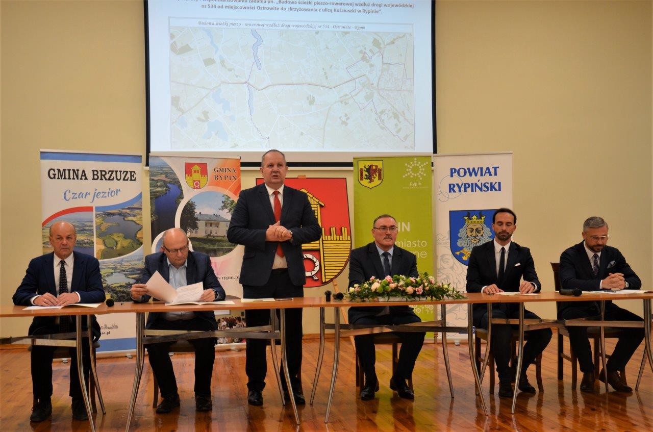 Gmina Brzuze przystąpiła do projektu pn. "Budowa ścieżki pieszo-rowerowej wzdłuż drogi wojewódzkiej nr 534 od miejscowości Ostrowite do skrzyżowania z ulicą Kościuszki w Rypinie". Porozumienie o współpracy i współfinansowaniu zadania zawarło 5 samorządów: Województwo Kujawsko-Pomorskie, Powiatu Rypiński, Miasto Rypin, Gmina Rypin oraz Gmina Brzuze. W dniu 28 października br. w sali Urzędu Gminy Rypin podpisy pod porozumieniem złożyli: wicemarszałek Zbigniew Sosnowski i dyrektor Departamentu Infrastruktury Drogowej Kujawsko-Pomorskiego Urzędu Marszałkowskiego Mirosław Graczyk, wójt gminy Rypin Janusz Tyburski, burmistrz miasta Rypin Paweł Grzybowski, starosta rypiński Jarosław Sochacki, a w imieniu gminy Brzuze wójt Jan Koprowski. Liderem projektu jest gmina Rypin, przez której teren przebiegać będzie najdłuższy odcinek ścieżki. Wykonawca dokumentacji projektowej został wyłoniony w drodze przetargu. Prace projektowe i wykup gruntów potrwają prawdopodobnie do końca 2022 r.