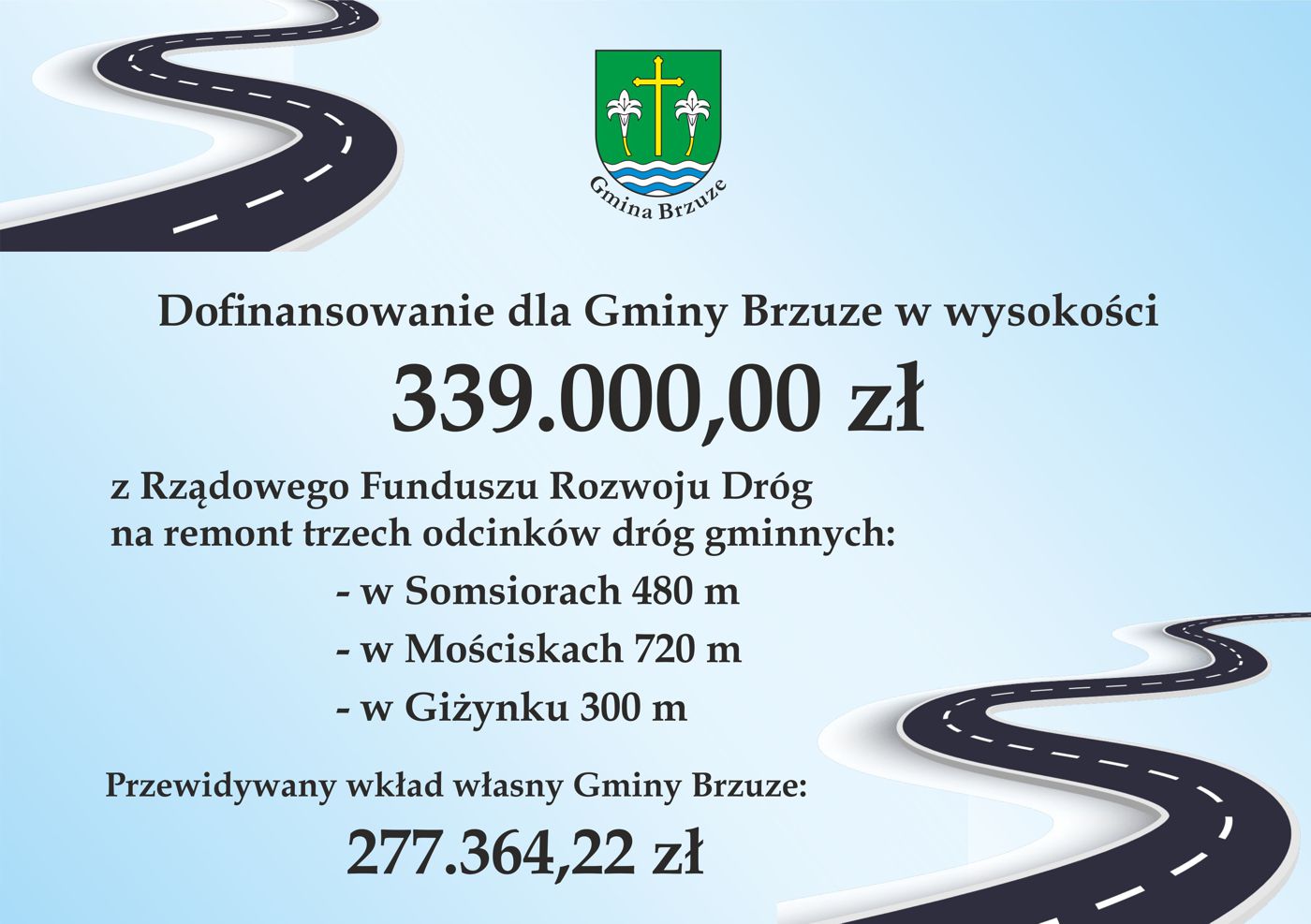 Otrzymaliśmy informację o pozytywnym rozpatrzeniu wniosku Gminy Brzuze dotyczącym dofinansowania remontów trzech dróg gminnych. Dotacja z Rządowego Funduszu Rozwoju Dróg, wraz ze środkami gminy, pomoże wyremontować kilkusetmetrowe odcinki dróg: w Giżynku, w strefie przepustu pod Piórkowo, w Mościskach, w kierunku Studzianki i w Somsiorach, od skrzyżowania do świetlicy. Z dotacją z rządowego funduszu oraz udziałem środków powiatu rypińskiego i gminy Brzuze, przewidziany jest także remont drogi powiatowej w Trąbinie. Z opinią o potrzebie umieszczenia tego odcinka w planie, zwrócił się do starosty Jarosława Sochackiego wójt Jan Koprowski, wskazując przede wszystkim na bardzo zły stan nawierzchni.