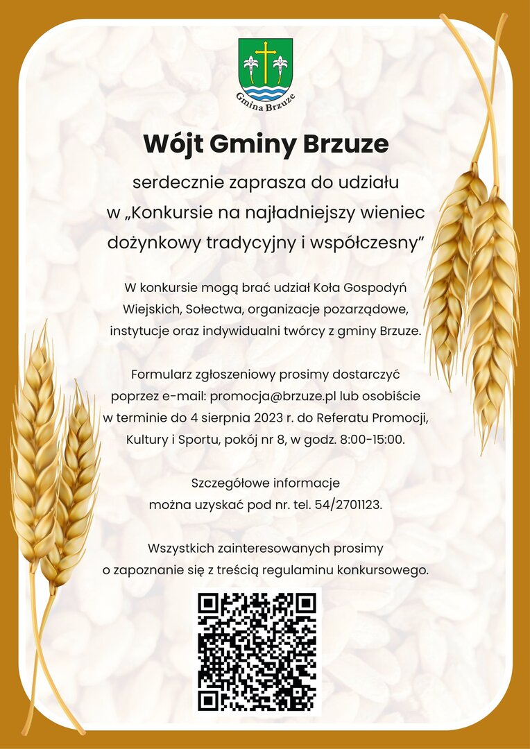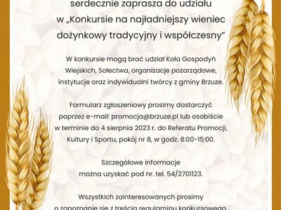 Wójt Gminy Brzuze serdecznie zaprasza do udziału w konkursie na najpiękniejszy wieniec dożynkowy. Wszystkich zainteresowanych prosimy o zapoznanie się z treścią regulaminu.